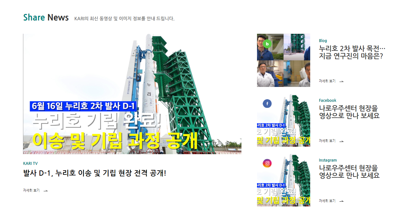 홈페이지에 방문하면 누리호 이송, 기립, 발사 과정을 전부 보여주고 있습니다.