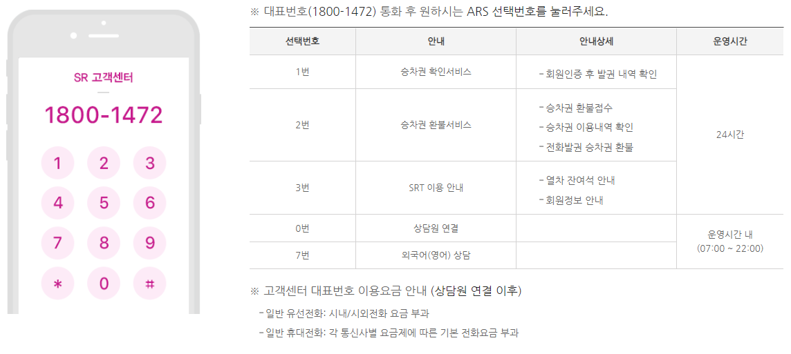SR 고객센터 전화번호는 1800-1472 이며 오전 7시부터 오후 10시까지 상담원 연결을 할수 있으며 365일 연중무휴로 운영합니다.