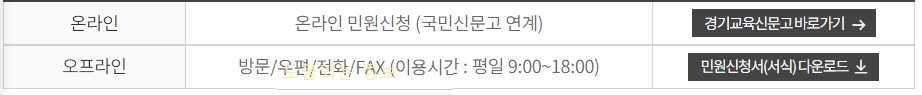 민원신청방법은 크게 온라인/오프라인으로 나누어집니다. 온라인은 경기교육신문고에서 민원신청을 받고 있으며 오프라인은 1) 방문/우편/전화/FAX로 민원 접수가 가능합니다. 오프라인 민원신청 이용시간은 평일 오전 9시부터 저녁6시까지입니다.