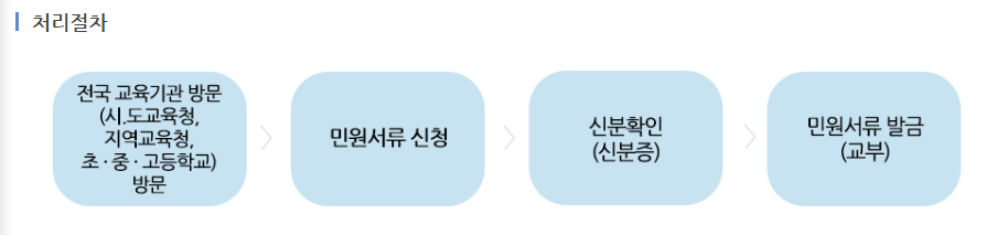 방문민원은 전국교육기관, 초중고등학교에 방문하여 필요한 제증명민원 발급과 민원제기를 할수있는 방법입니다. 처리절차는 다음과 같습니다.
