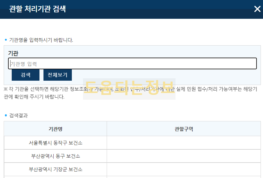 1. https://www.gov.kr/mw/ 에 접속하여 관할보건소를 찾습니다.