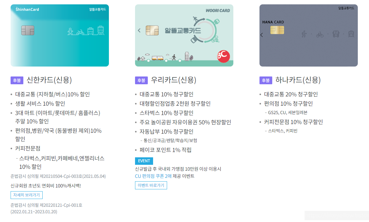 알뜰교통카드는 버스, 지하철 이용시 대중교통비를 할인해주는 교통 전용카드로 자전거나 도보 이용시 이동한 거리를 마일리지로 적립하는 방법입니다. 카드사 추가할인 혜택 포함시 최대 30%까지 대중교통비 절감을 할 수 있습니다.