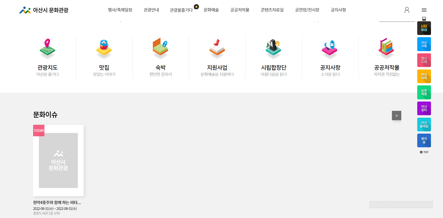 아산시청 홈페이지 첫화면 좌측>문화관광