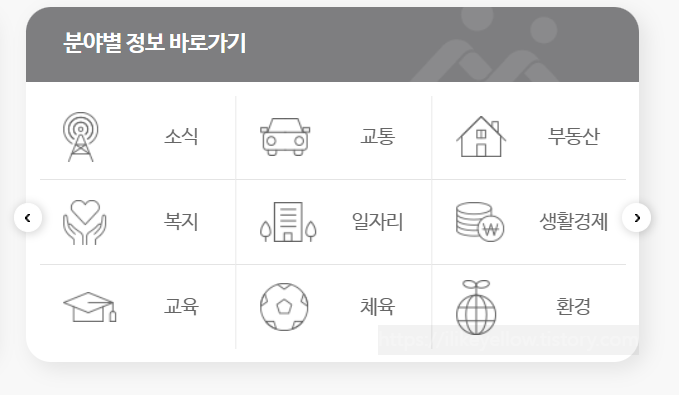 - 교통, 부동산, 복지, 일자리, 생활경제, 교육, 체육, 환경, 소식.