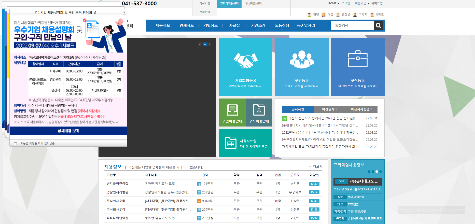 아산시 일자리 정보를 궁금해하는 분들이 있는데 아산시청 홈페이지 첫화면 하단>분야별정보바로가기>복지 순으로 접속하면 일자리 정보가 상세하게 나와있습니다. 아주 많은 정보가 수시로 업데이트되고 잘 관리되고 있습니다. 구인구직활동에 관심있는분들은 꼭 방문하시기 바랍니다.