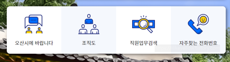 3) 홈페이지 첫화면에서 하단으로 가다보면 오산시청 홈페이지 조직도, 직원업무검색, 그리고 전화번호가 있습니다. 오산시청에 간단한 민원을 넣어야할때는 복잡한 민원절차를 거치기 보다는 바로 담당 직원과 연결하여 문의하는게 빠릅니다. 이때 "직원업무검색"창에서 업무검색을 한 후 담당자를 찾아 전화를 거는게 빠릅니다.