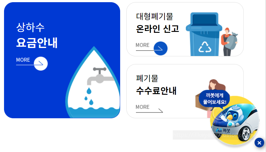 6) 상하수요금조회, 대형폐기물온라인신고, 폐기물수수료 알아보기 등 생활에 도움되는 정보도 있습니다.