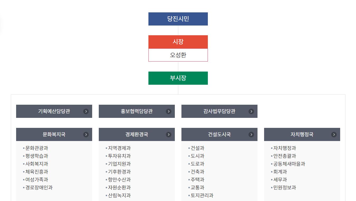 당진시청 조직도입니다. 건설과, 도시과, 건축과, 주택과, 교통과, 허가과가 있으며 각 부서를 선택하면 전화번호를 볼 수 있습니다. 당진시청 직원검색을 이용해도 부서, 담당자, 전화번호 조회를 할 수 있습니다. 당진시청 전화번호 검색