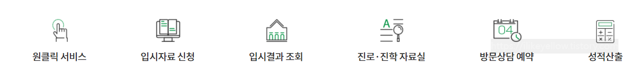 입시자료 신청, 입시 결과 조회, 진로-진학 자료실, 방문상담예약, 성적산출과 같은 서비스가 있으며, 수시 정시 편입학에 대한 정보, 입학상담 서비스를 입학처 홈페이지에서 모두 확인할 수 있습니다.