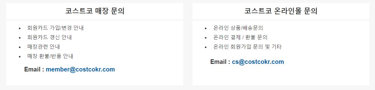 고객센터 운영시간은 오전 9시부터 오후 9시까지이며 "1,1 · 설날 · 추석" 휴무입니다. 이메일로도 문의가 가능하며 코스트코 매장 문의 member@costcokr.com 온라인몰 문의 cs@costcokr.com입니다.
