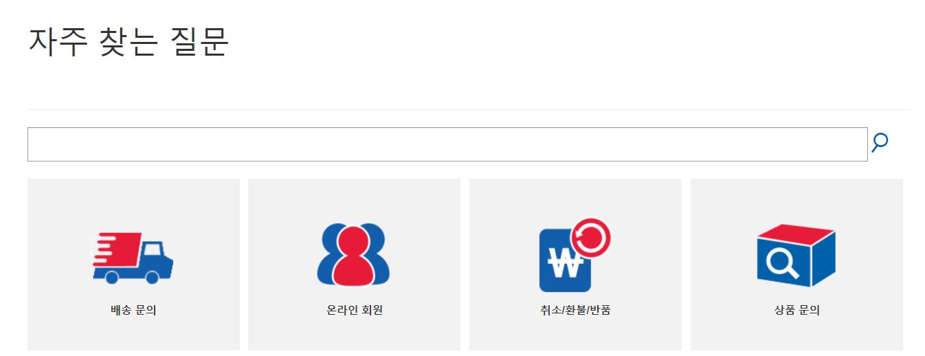 자주 찾는 질문이 메인페이지로 나타납니다. 자주 찾는 질문에는 배송 문의, 온라인 회원, 취소 · 환불 · 반품, 상품 문의, 상품 후기, 주문/결제, 매장, 타이어 등의 질문과 답변이 있으니 검색 후 고객센터 이용 시 편리하고 신속하게 해결이 가능합니다.