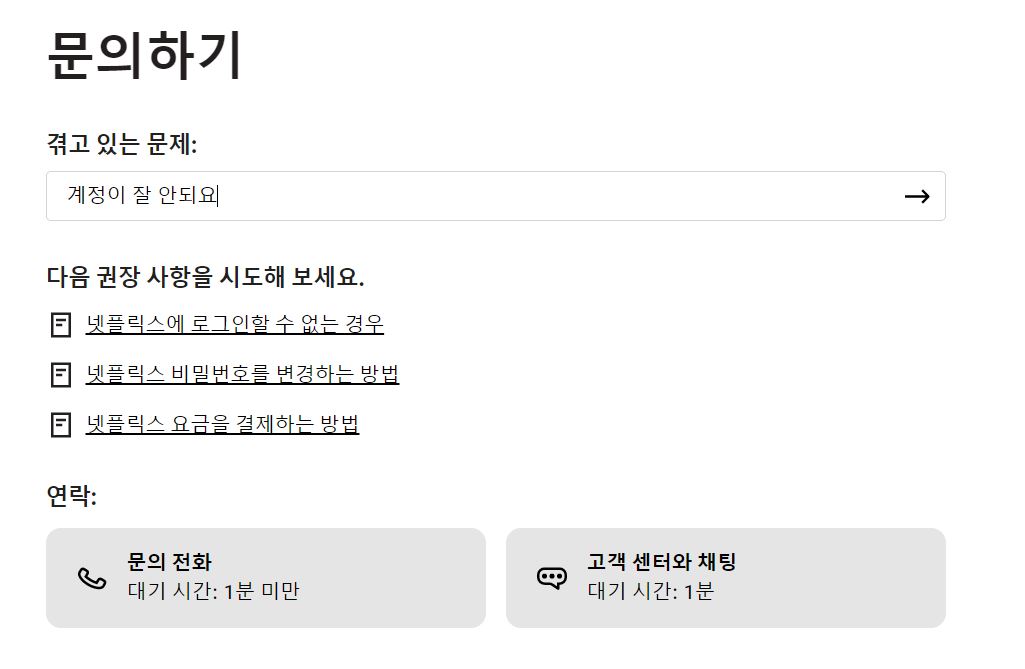 넷플릭스 고객센터 홈페이지에서 하단으로 가면 문의하기가 있고 여기에 접근합니다.