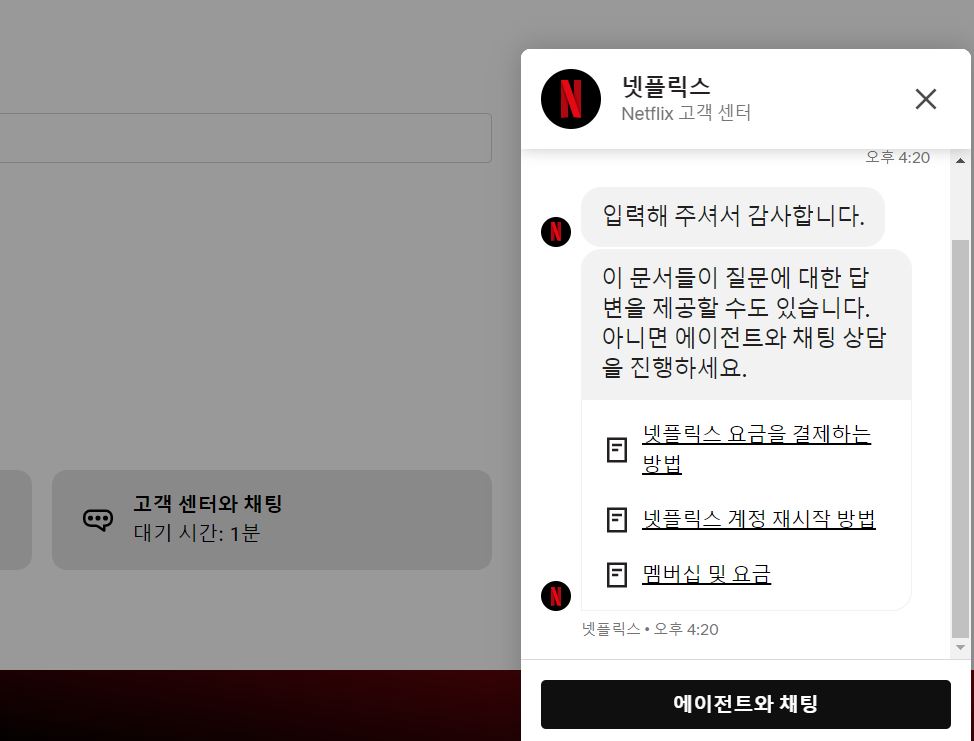 넷플릭스 고객센터 홈페이지에서 하단으로 가면 문의하기가 있고 여기에 접근합니다.