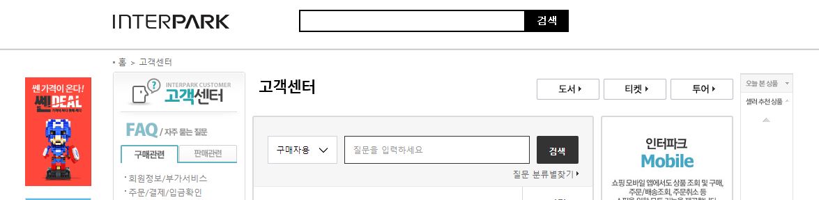 인터파크 쇼핑 고객센터 메인화면입니다.