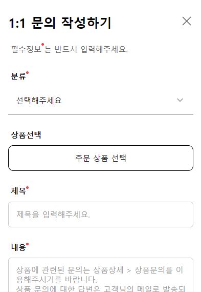 1:1 문의는 분류, 상품선택, 제목, 내용을 기재한 후 문의하기를 하면 수일 내에 상담사가 답변을 하며 필요시 SMS로 답변 결과 수신도 가능합니다.