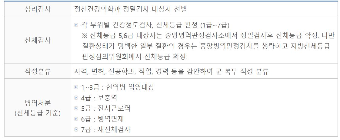 병역검사과정은 심리> 신체> 적성검사> 병역처분 순으로 진행되며 병역판정검사 통지서에 기재된 일시 및 장소에서 받게 되고 소요시간은 약 4시간입니다.