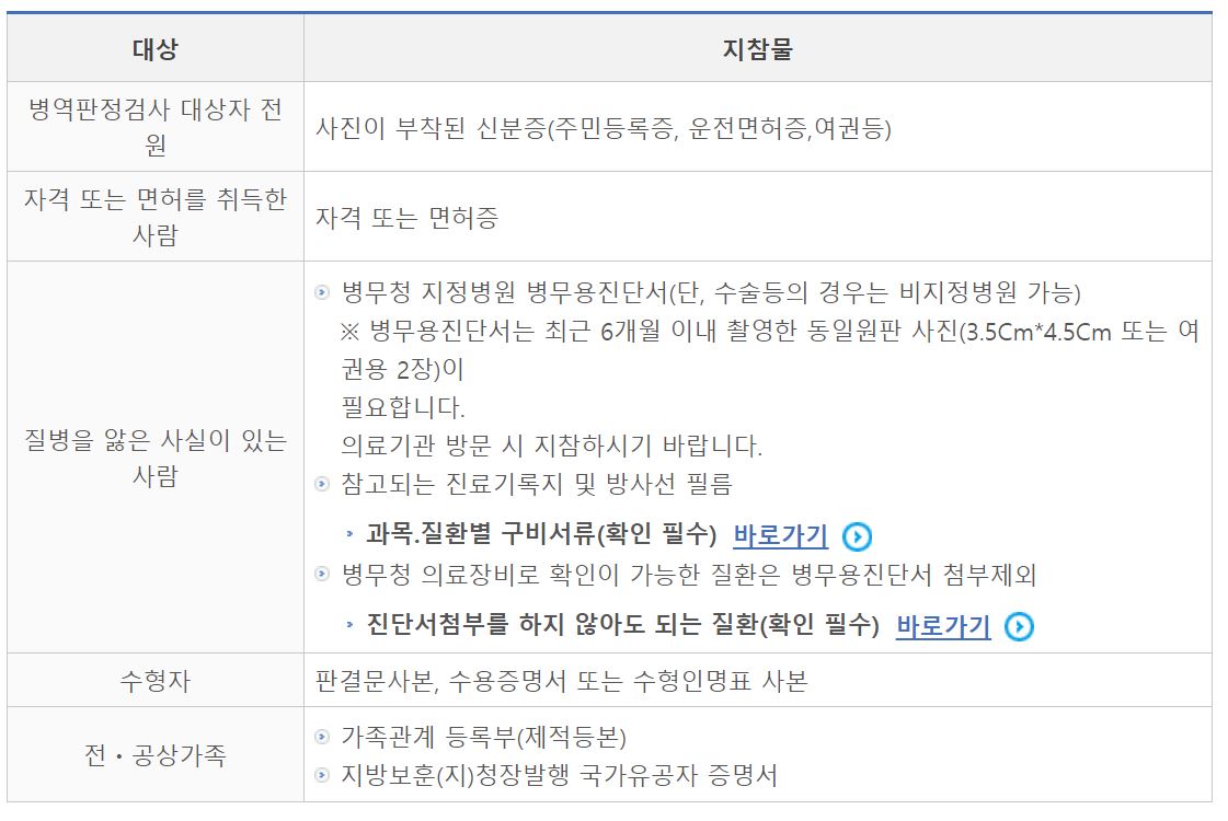 병역판정검사를 위해 서울지방병무청에 방문하는 분들은 지참물을 참고하시기 바라며 아래 과정도 상세하게 나와있습니다. 질병을 앓은 사실이 있는 사람의 경우 과목. 질환별 구비서류가 필요하고 진단서 첨부를 하지 않아도 되는 질환 확인도 해야 합니다. 서울병무청 홈페이지 > 병역판정검사에서 확인 가능합니다. 서울병무청 홈페이지 바로가기
