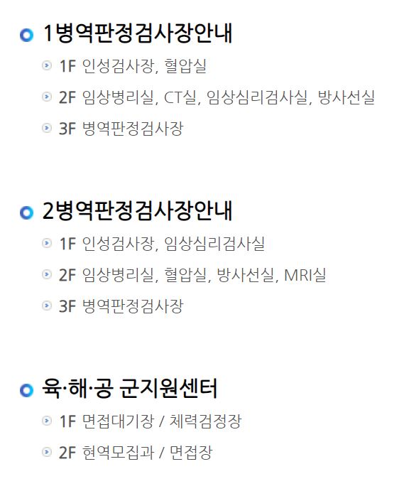 병역판정검사를 위해 서울지방병무청에 방문하는 분들은 지참물을 참고하시기 바라며 아래 과정도 상세하게 나와있습니다. 질병을 앓은 사실이 있는 사람의 경우 과목. 질환별 구비서류가 필요하고 진단서 첨부를 하지 않아도 되는 질환 확인도 해야 합니다. 서울병무청 홈페이지 > 병역판정검사에서 확인 가능합니다. 서울병무청 홈페이지 바로가기