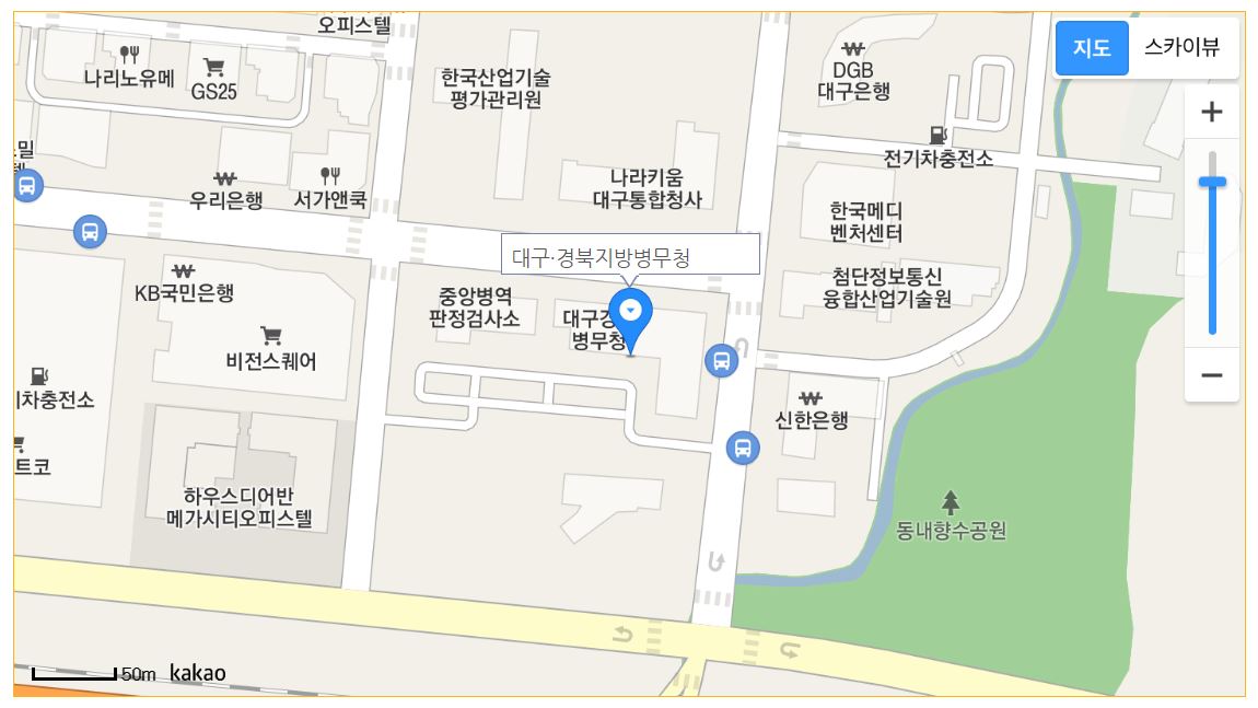 대구경북지방병무청 방문 시 아래 교통편을 참고하시면 빠르고 편리하게 방문 가능합니다.