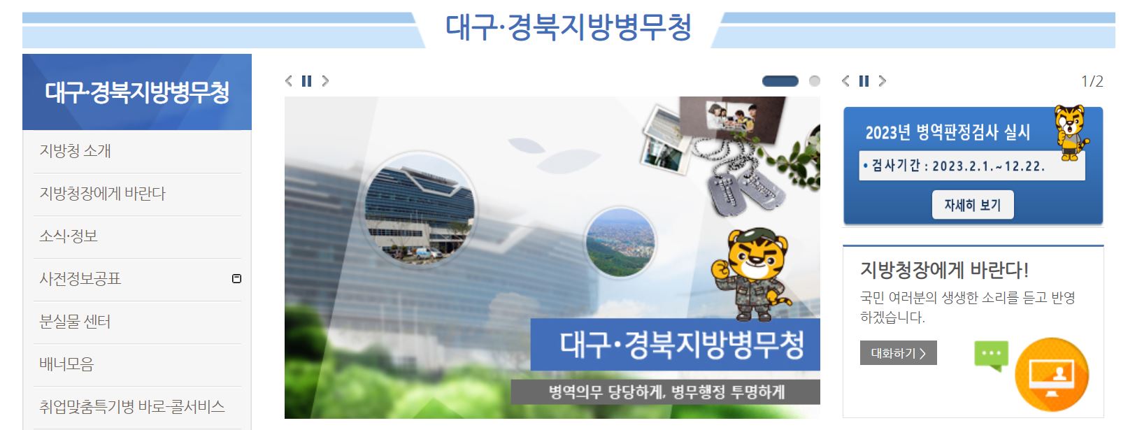 구글 검색창이나 평소 이용하는 포털 검색창에 대구경북지방병무청을 입력하고 검색하면 대구경북지방병무청 홈페이지 url(https://www.mma.go.kr)이 나오고 여기에 접근하면 대구경북지방병무청 홈페이지 이용이 가능합니다.