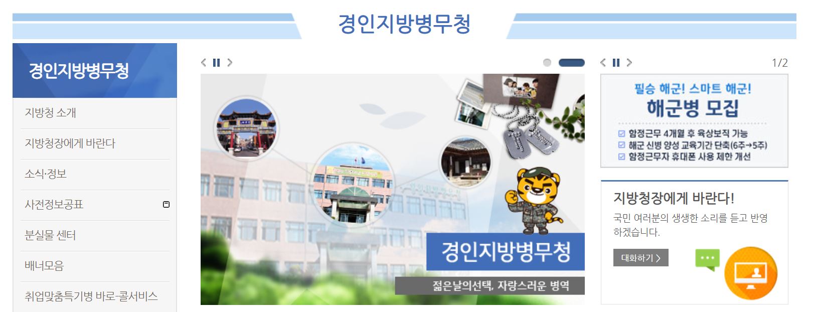 경인지방병무청 홈페이지는 병무행정 서비스 및 소통 공간을 제공하여 병무를 이행하는 사람들을 위한 공간입니다. 이 페이지에서는 경인지방병무청 홈페이지 이용과 홈페이지 바로가기 서비스를 제공하여 서비스를 편리하게 이용하도록 하였습니다. 이용 중 궁금한 사항은 댓글을 남겨주심 실시간으로 답변을 드립니다.