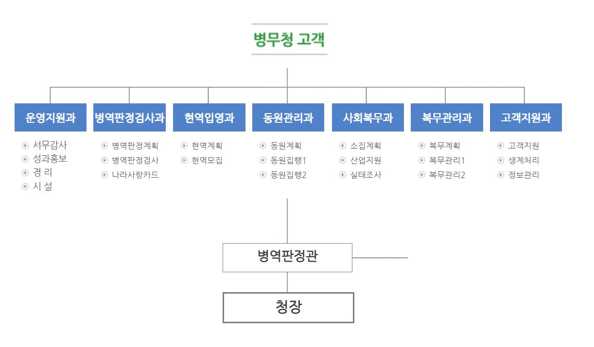 경인지방병무청은 청장실을 비롯하여 병역판정관, 운영지원과 등이 있습니다. 하단 경인지방병무청 조직도를 참고하시기 바랍니다. 경인지방병무청 부서별 전화번호는 경인지방병무청 홈페이지> 지방청 소개에서 확인 가능합니다. 경인지방병무청 홈페이지 바로가기