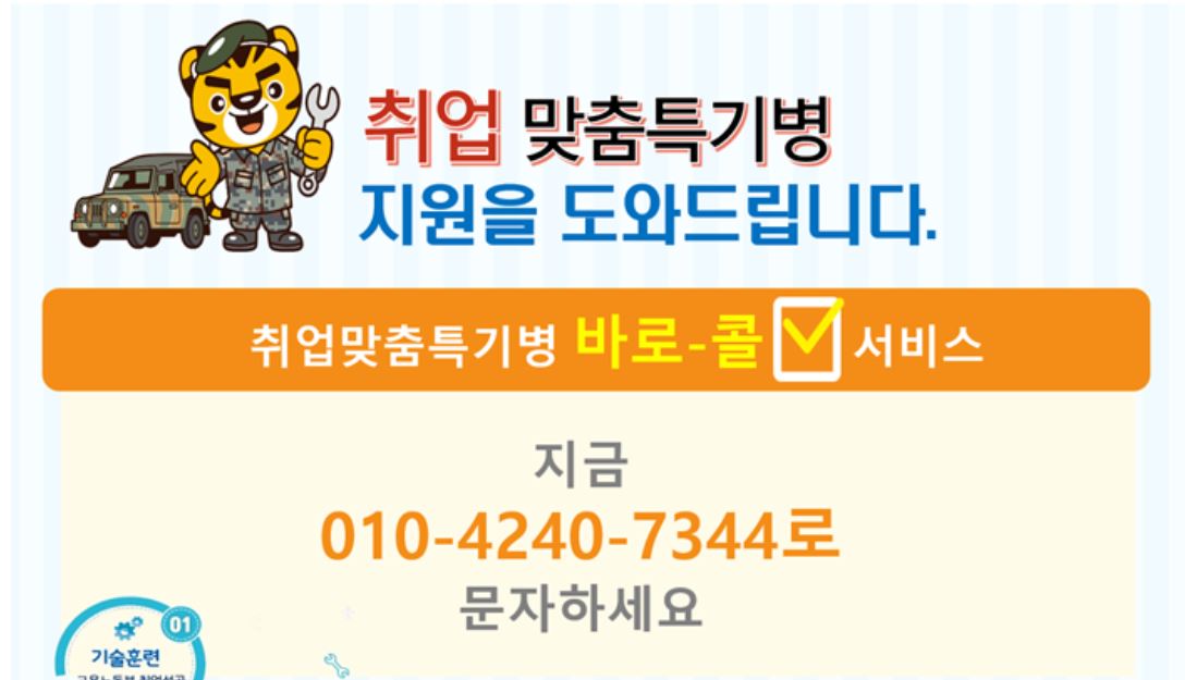 경인지방병무청에서는 취업맞춤특기병 바로-콜서비스를 운영하고 있습니다. 취업맞춤특기병 지원을 도와드리며 개인상담은 문자 확인 후 상담 전화를 받을 수 있고 기술훈련기관은 전화를 드린 후 현장방문 상담을 진행하오니 하단 번호를 참고하시어 취업맞춤특기병 지원 신청 가능합니다.
