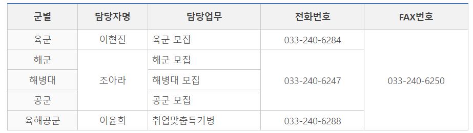 강원지방병무청 군지원(모병)을 원하는 경우 구비서류 제출을 해야하는데 우편 발송 시 1) 지방병무청명, 담당부서명 2) 우편번호, 주소 3) 응시한 군과 수험번호를 기재한 후 발송해야 하며 주소와 군별 전화번호 및 FAX번호는 하단 표를 참고하시기 바랍니다.
