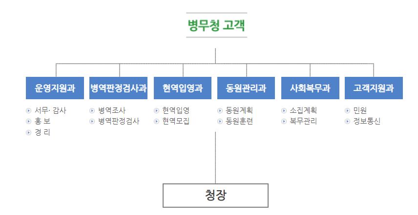 강원지방병무청은 운영지원과, 병역판정검사과, 현역입영과, 동원관리과, 사회복무과, 고객지원과가 있으며 각 부서별 세부 업무는 하단 표를 참고하시기 바랍니다.