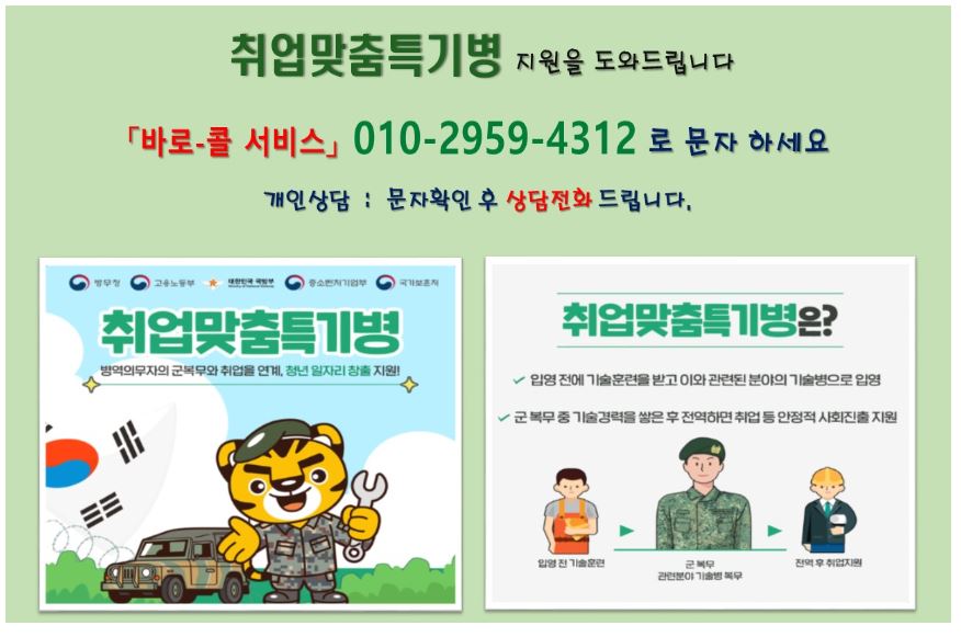 광주 전남 지방 병무청 홈페이지에는 취업맞춤특기병 바로-콜 서비스를 제공하고 있습니다. 취업맞춤특기병은 입영 전 기술훈련을 받고 이와 관련한 분야의 기술병으로 입영하는 것으로 군 복무중 기술경력을 쌓은 후 전역시 취업 등 안정적 사회진출을 지원합니다.