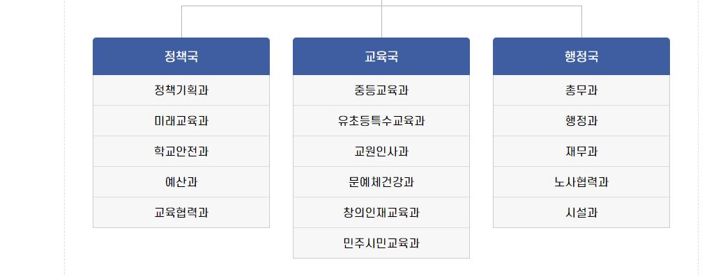 전라북도교육청은 정책국 교육국 행정국이 있으며 세부부서는 하단에 있습니다. 청사는 본관과 별관 2개(창조나래, 세종빌딩)로 되어있습니다.