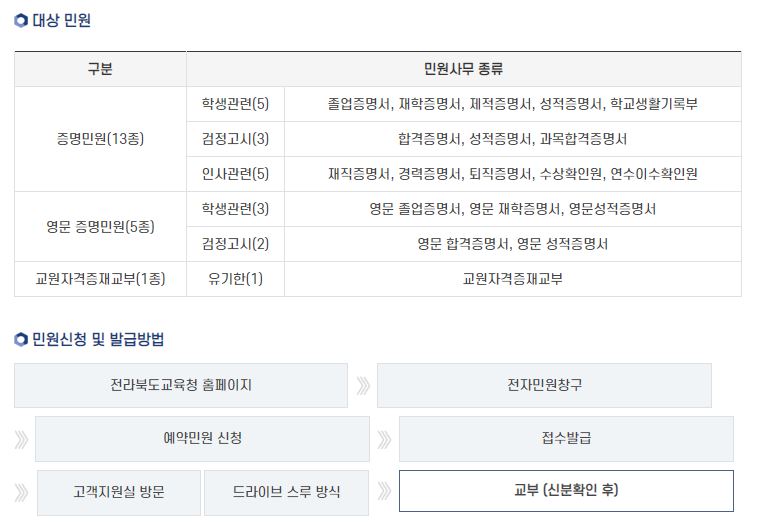 증명민원 신청시 발급방법 수령가능한 방문일자와 시각을 선택해 주시기 바라며 신청한 방문일로부터 3일 경과 시 자동 폐기가 되오니 참고하시기 바랍니다. 교원자격증 재교부의 경우 방문이나 빠른우편으로 수령 가능하며 우편신청을 하는 경우 요금이 부과됩니다. 민원신청은 하단 바로가기에서 이용 가능합니다.