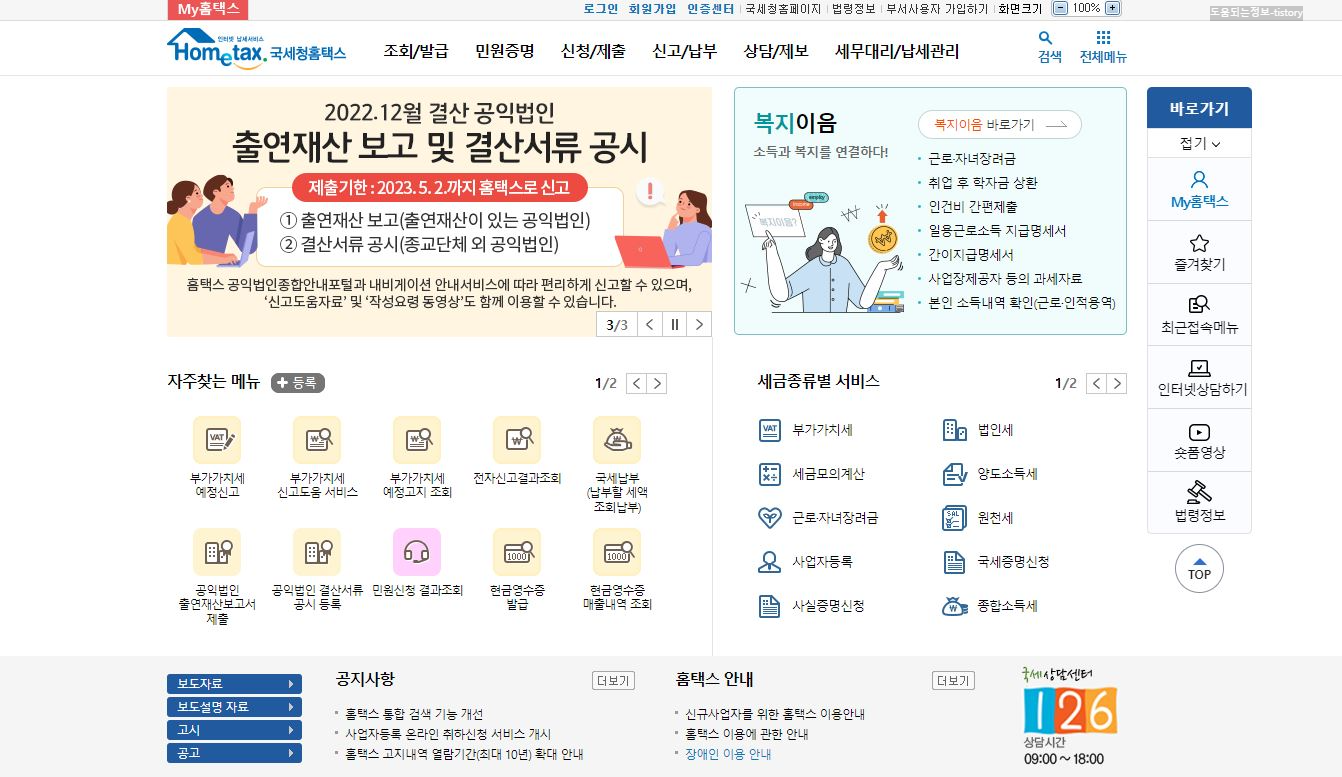 홈택스 홈페이지 첫화면은 아래와 같습니다.