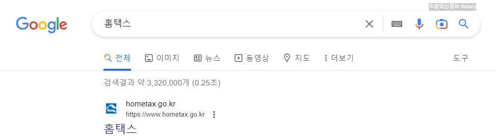 구글 검색창에 홈택스를 입력하고 검색하면 홈택스 홈페이지 주소가 나옵니다. 여기에 접근하면 홈택스 홈페이지 이용이 가능합니다.