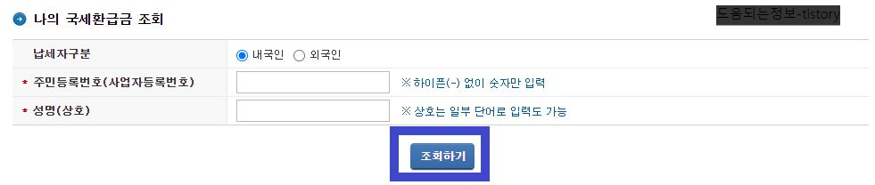 아래와 같이 나의 국세환급금 조회 서비스창이 나오게 되고 이곳에 납세자구분(내국인 또는 외국인), 주민등록번호(사업자등록번호), 성명(상호)을 입력하고 '조회하기' 버튼을 터치합니다.