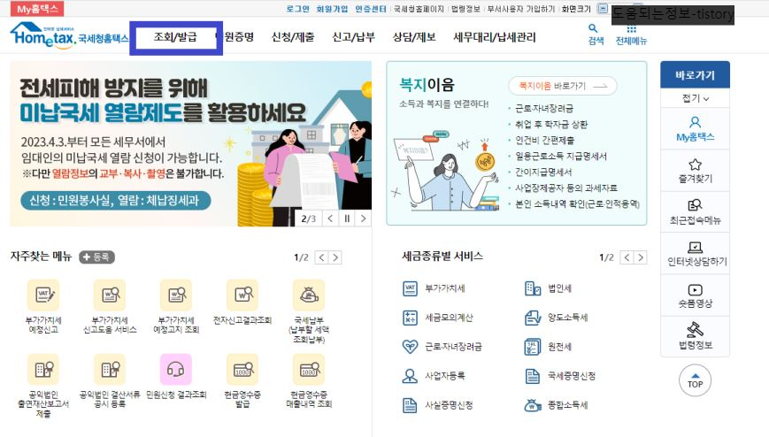 홈택스 (https://www.hometax.go.kr)에 접속합니다. 아래는 홈택스 홈페이지 첫 화면이고 상단 메뉴에 보면 조회/발급 서비스가 있습니다. 여기를 터치합니다.