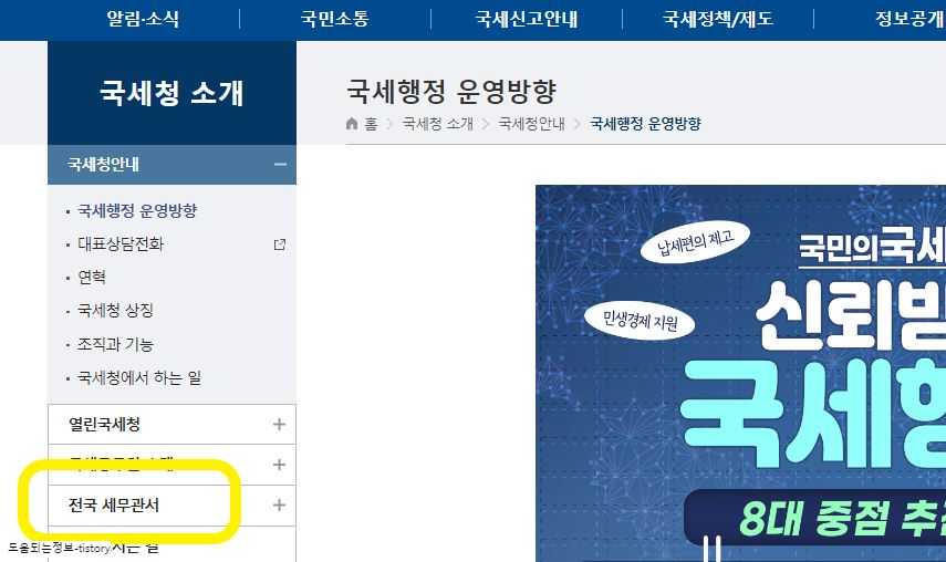4) 좌측 메뉴의 전국 세무관서 메뉴에 접근합니다.