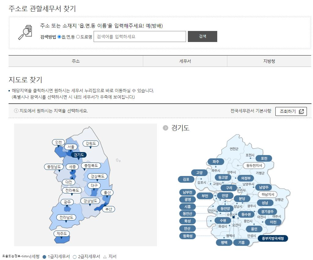 여기에서는 국세청홈택스 홈페이지에서 제공하는 전국 세무서 찾기 서비스를 제공합니다.