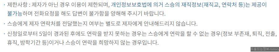 *신청을 하였음에도 스승에게서 연락이 오지 않는 경우는 스승이 정보 부존재, 퇴직, 전출, 휴직, 방학기간, 스승이 희망하지 않는 경우이오니 이용시 참고하시기 바랍니다.