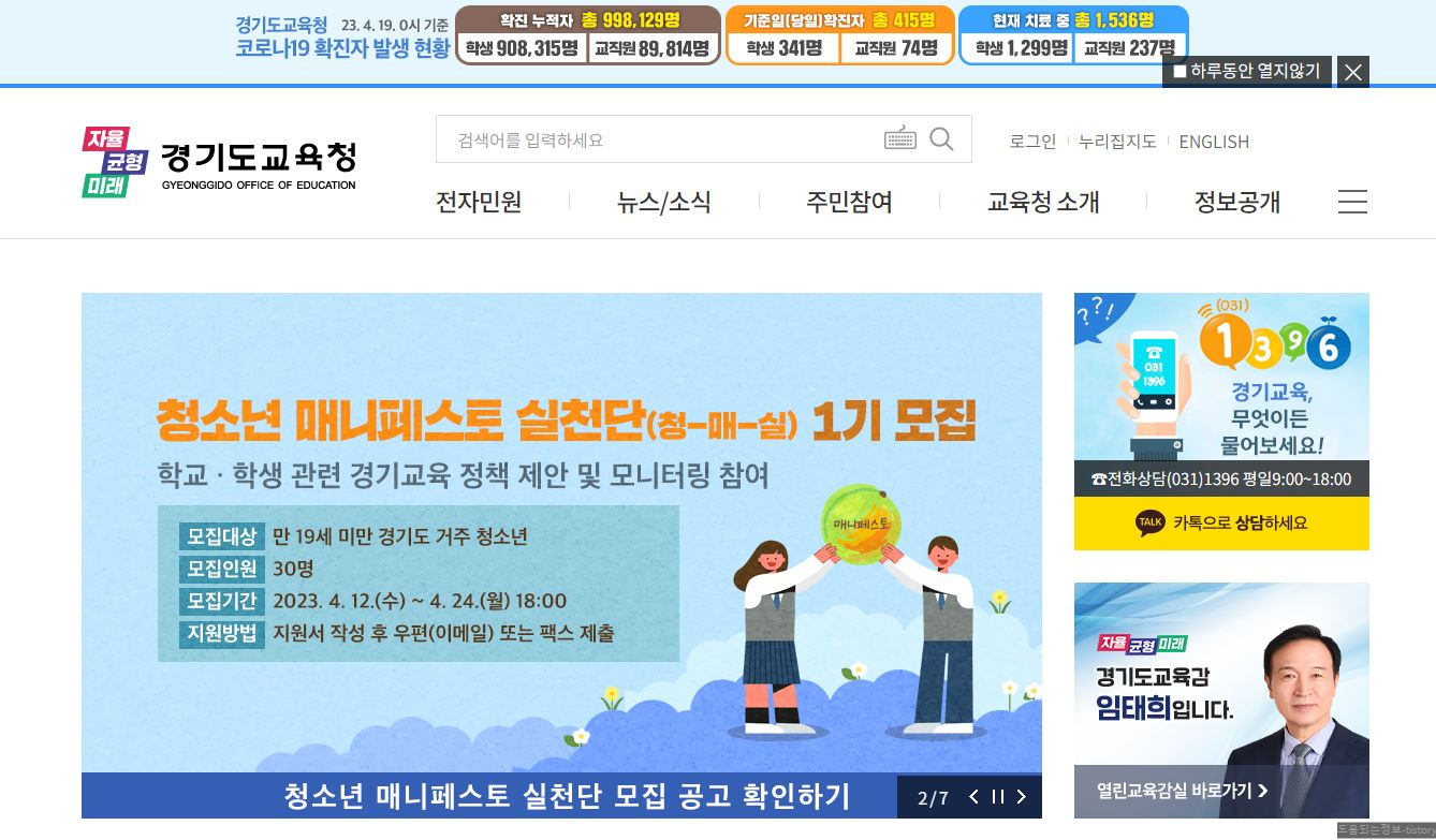 2. 경기도 교육청 홈페이지에 접근하면 아래처럼 첫 화면을 볼 수 있습니다.