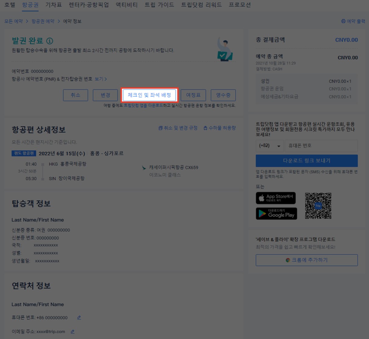트립닷컴 온라인 좌석지정