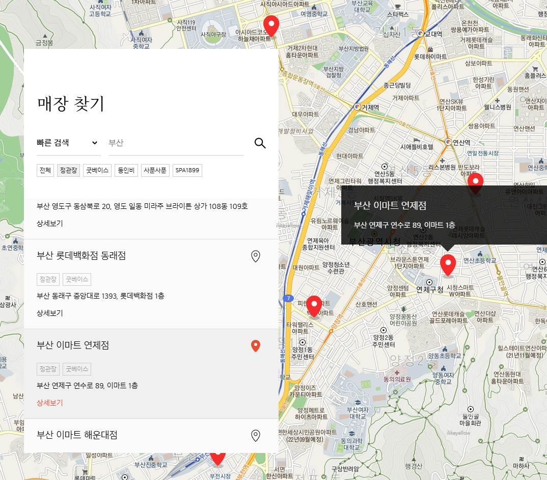 각 매장 정보에는 주소, 전화번호, 운영 시간 등이 안내되어 있어 방문 전 확인할 수 있습니다.