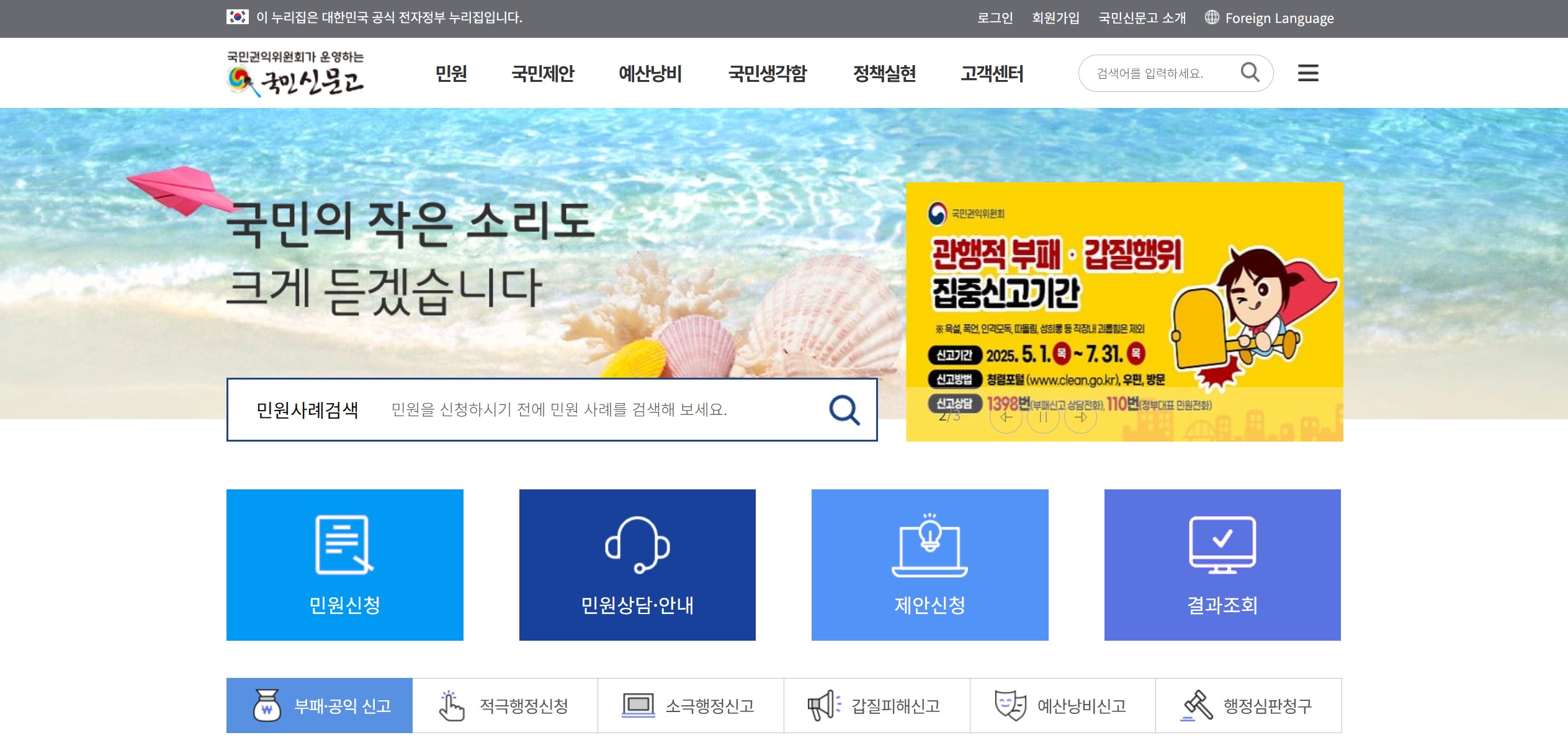 국민권익위원회가 운영하는 온라인 국민참여포털로 민원신청, 국민제안, 정책참여 창구