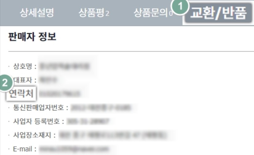 ① 상품 상세 페이지 [교환/반품] 탭에서 판매자 정보 확인 가능