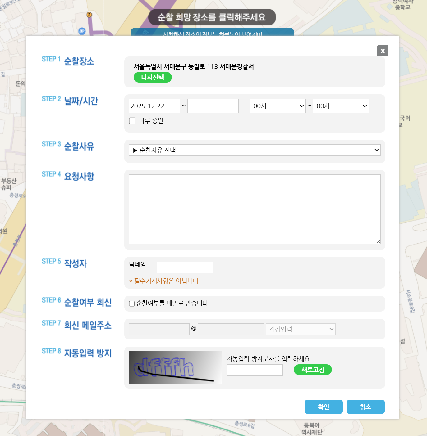 순찰장소, 날짜/시간, 순찰사유, 요청사항, 작성자, 순찰여부 회신, 회신 메일주소 등