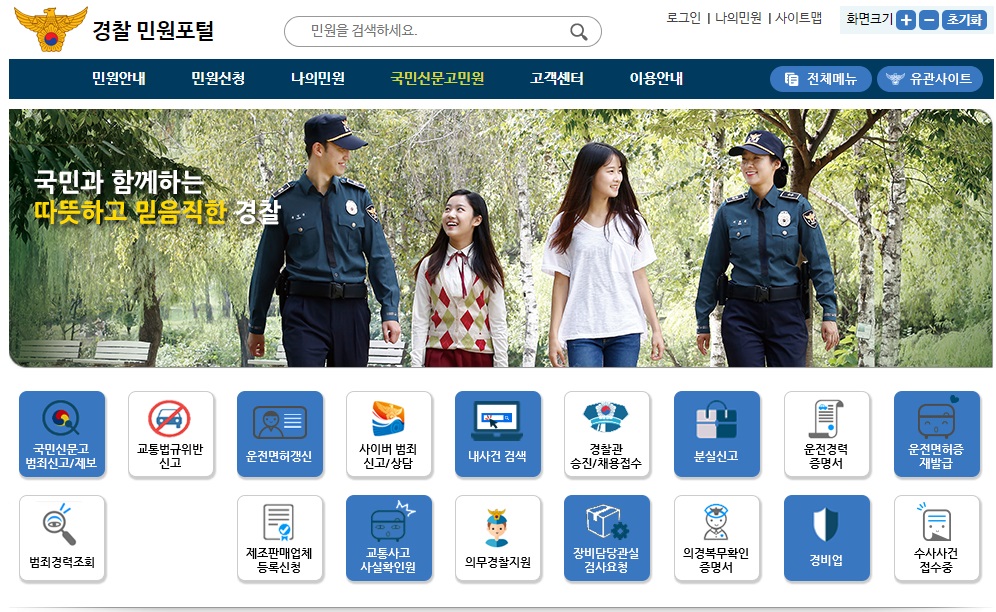 경찰민원포털에서는 경찰서와 관련된 모든 업무를 통합하여 볼 수가 있습니다. 전국 모든 경찰서에서 공통이기 때문에 간단한 민원 업무는 경찰 민원 포털을 통해 보실 수도 있습니다.