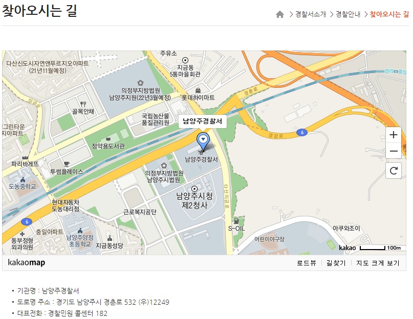 남양주경찰서의 위치안내입니다. 주소는 경기도 남양주시 경춘로 532이며, 대표전화는 경찰민원 콜센터인 182로 전화를 하시면 됩니다.