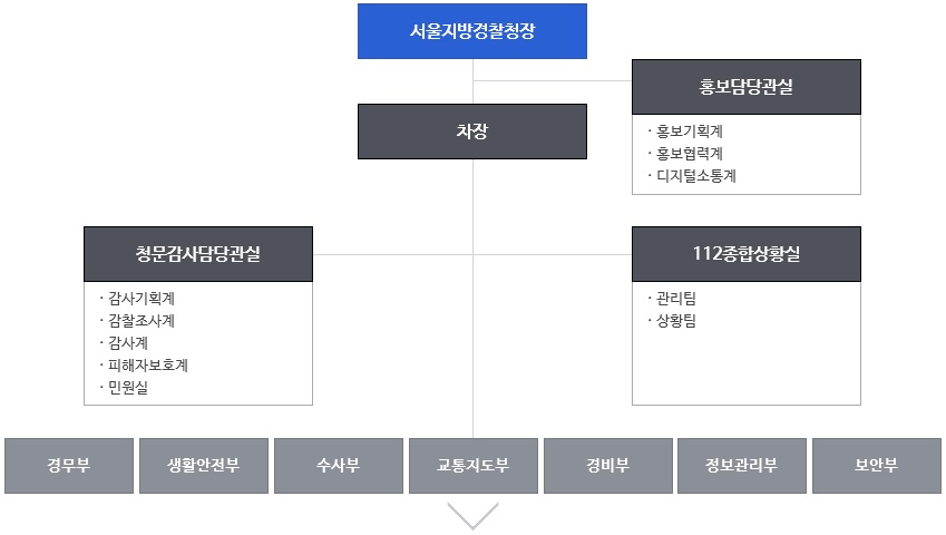 여러 메뉴중에서도 가장 궁금해 하실 만한 내용이 바로 서울지방경찰의 조직과 업무에 관한 내용이 아닐까 싶은데요. 서울지방경찰청은 지방청장아래에 차장, 청문감사담당관, 112종합상황실을 두고 아래에 각부서가 있습니다. 자세한 부서 소개는 아래를 참고해 주세요.