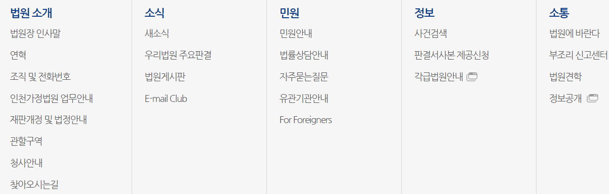 인천가정법원 홈페이지에서 제공하는 메뉴는 다음과 같습니다. 법원소개, 소식, 민원, 정보, 소통의 큰 5가지 메뉴안에 다양한 서비스를 제공하고 있습니다.