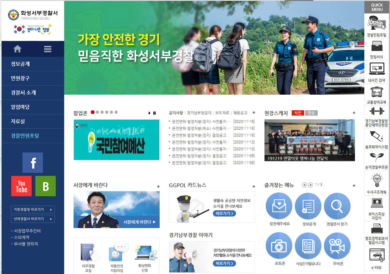 화성서부경찰서 홈페이지의 메인화면은 다음과 같습니다. 대부분의 경찰서 홈페이지는 모두 비슷한 구성을 하고 있습니다. 홈페이지의 좌측에 주요메뉴가 있는 것을 보실 수 있습니다. 지방경찰청마다 홈페이지 구성이 다른 듯해 보입니다.